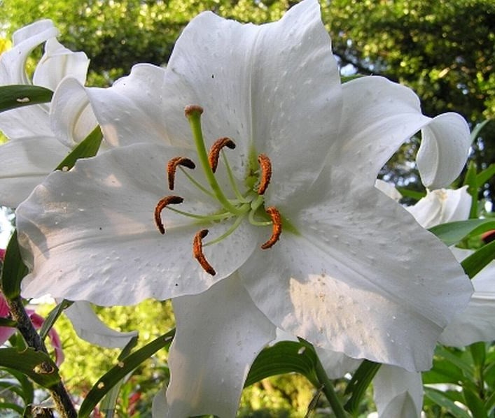 Читать далееKasablanka – это один из самых красивых белоснежных сортов, который одаривает цветоводов роскошными соцветиями исключительно однотонного белого цвета. Растение не маленькое, так как показатели в 120 см – это некая норма для этого восточного сорта. Диаметр бутонов также не маленький и составляет примерно 25 см. Ценность этого сорта еще в том, что на одном цветоносе формируется около девяти соцветий, которые одновременно распускаются.